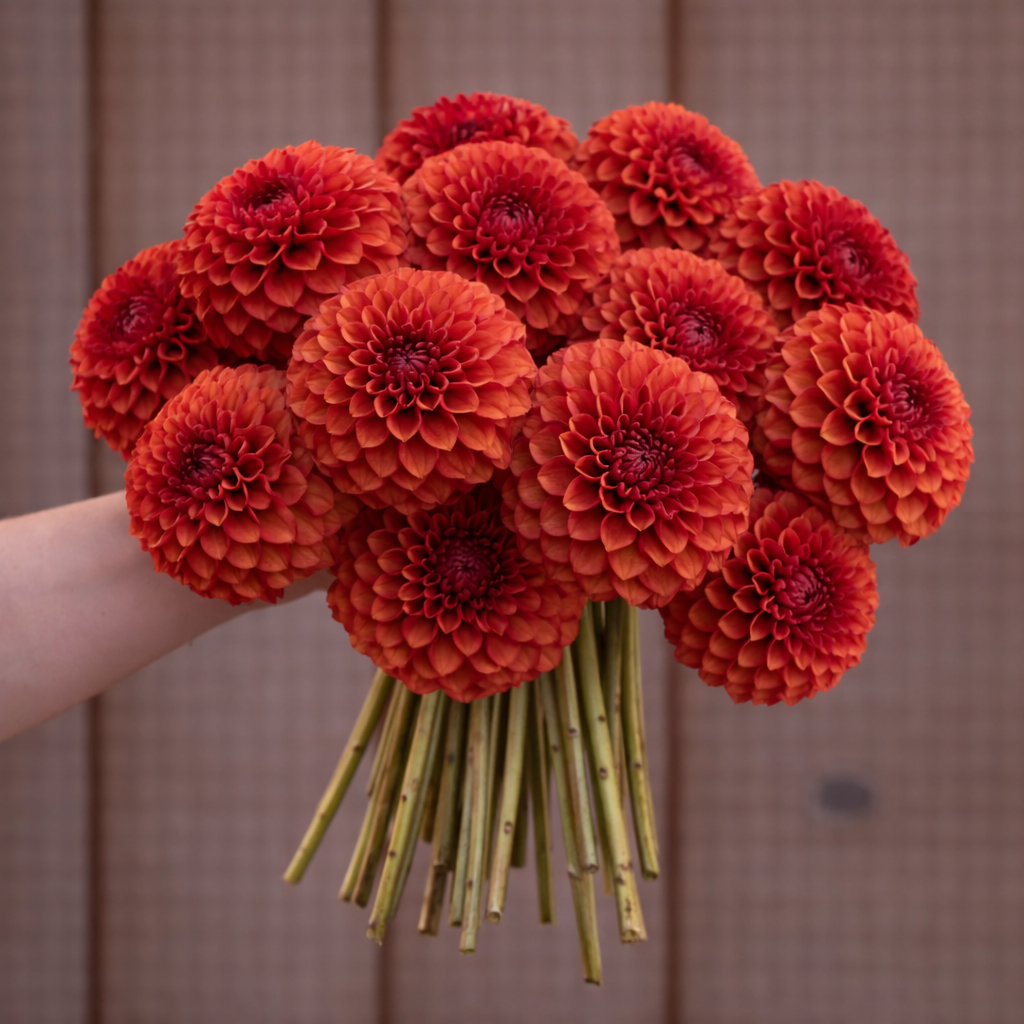 Warm, rustic copper-bronze blooms with depth and autumnal richness. Brown Sugar adds a cozy, jewel-toned presence to cutting gardens and bouquets alike. These ball shaped flowers start as bright copper-orange and deepen to rich terracotta and burnt bronze tones toward the centre, bringing incredible seasonal character to fall arrangements or market bunches.