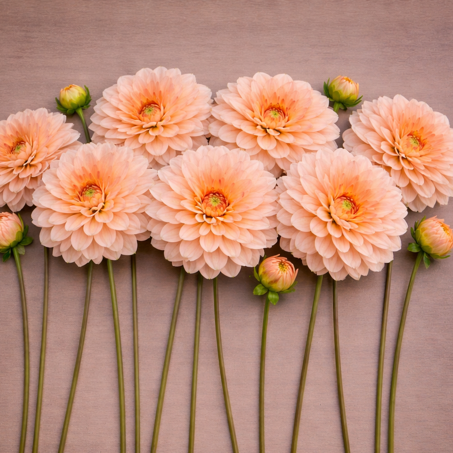 Warm peach-to-apricot blooms with a soft coral glow. Mister Frans is that “sunset” waterlily dahlia that makes every bouquet feel expensive. The blooms are smooth, open, and perfectly shaped, with warm pastel tones that play beautifully with blush, cream, bronze, and late summer garden colours. Growers love it for cut flowers because the form holds well and the colour photographs like a dream.