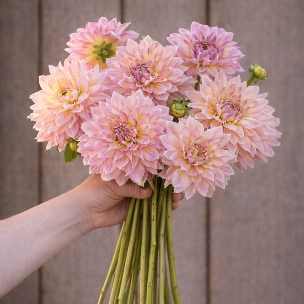 Expect plants around 4 – 5 ft tall with long, sturdy stems that carry those giant strawberry-pink and cream blooms beautifully. The colour reads soft and warm in northern light, making it a favourite for wedding work and premium market bouquets. Because the bloom heads are large and heavy, spacing and staking are important for top quality cuts. Strawberry Ice thrives in full sun and rewards growers with a steady flush of giant blooms all season long.